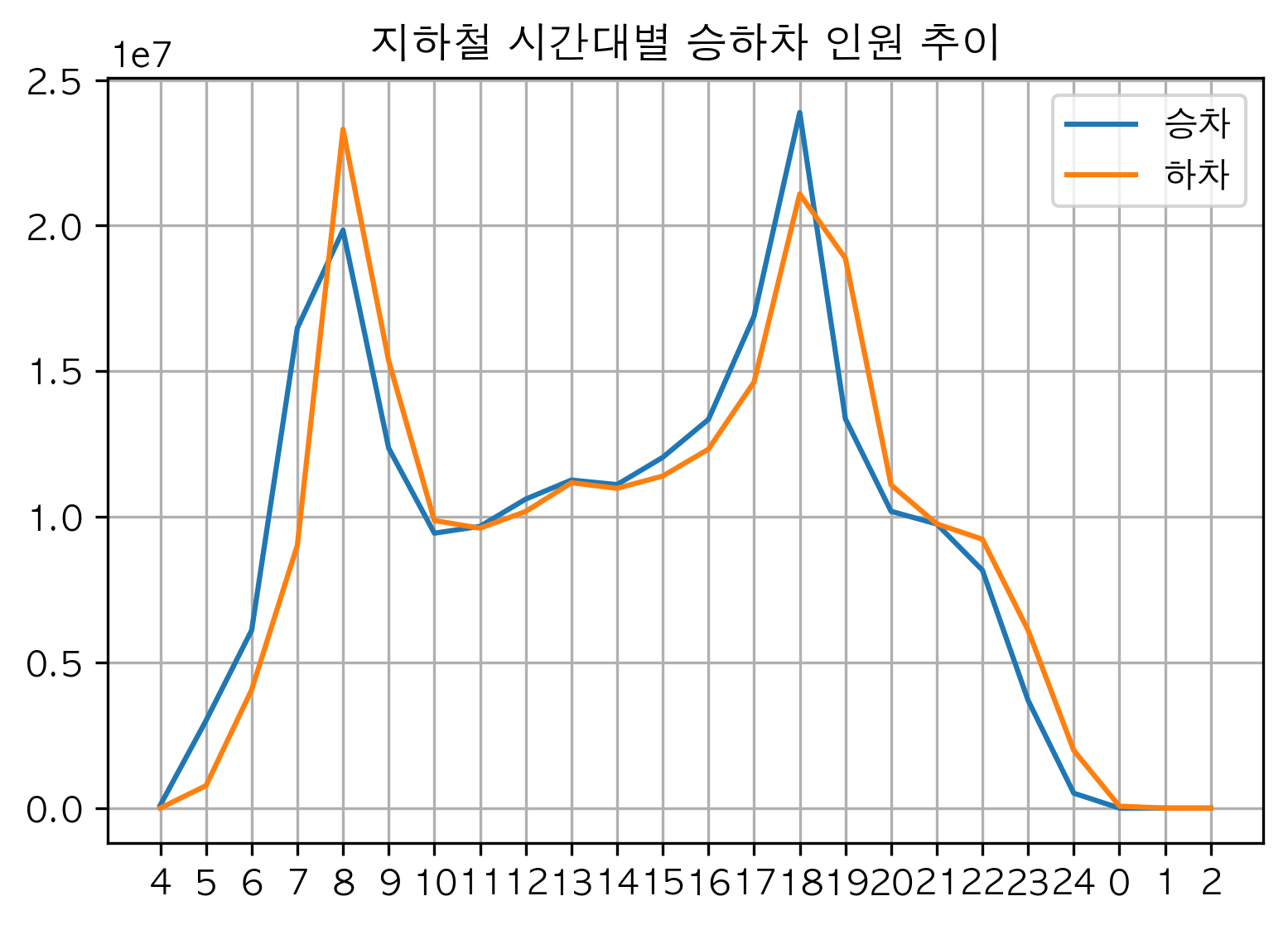 지하철 시간대 별 승하차 인원 추이